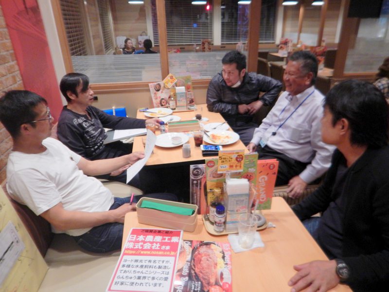 松山市内のファミレスで若手会員中心の打ち合わせ。