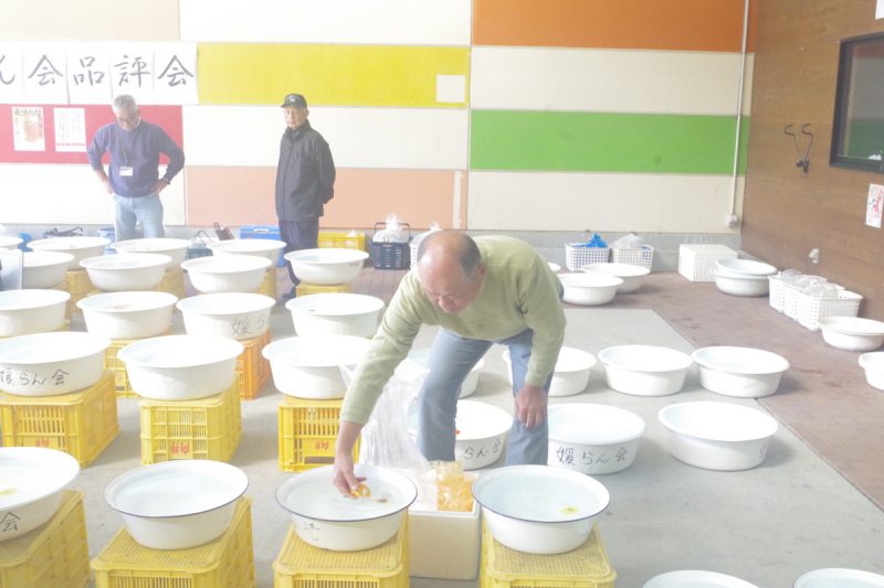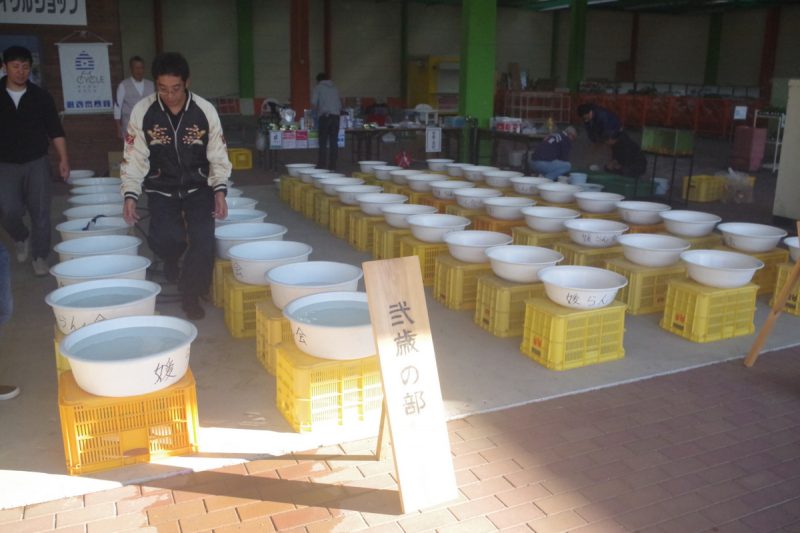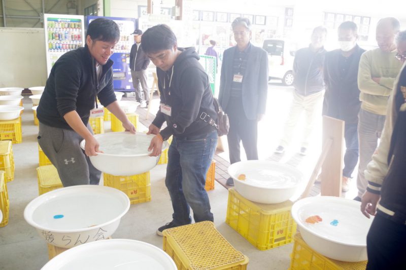 1尾に1個の洗面器を割り当て、他の魚と交わらないようにする「洗面器審査」は媛らん会の特徴のひとつ。
