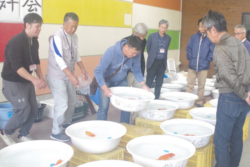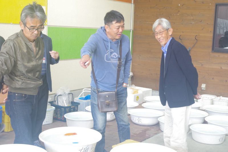 開会式が近づき、参加者は出品魚を洗面器に入れていきます。