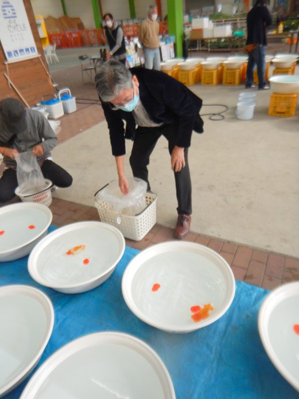 開会20分前ほどから、洗面器にらんちゅうを入れていきます。