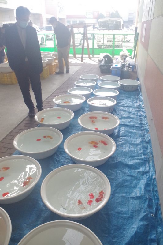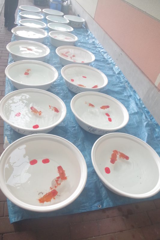 当歳魚の洗面器は比較的小さいので会員が1人で移動できるし、親魚は洗面器は大きいものの出品魚が少ないので移動が少ないということで、二歳魚部門だけ「飼育者専用の魚溜まり」方式。洗面を余分に用意し、会員ごとに数匹ずつ魚を入れ、そこで審査。順位決定後に専用のバケツで移動する…という少々面倒なやり方ですが、大きい洗面器を運ぶときにどうしても人と人の接触が増えるので、それを軽減するための措置。