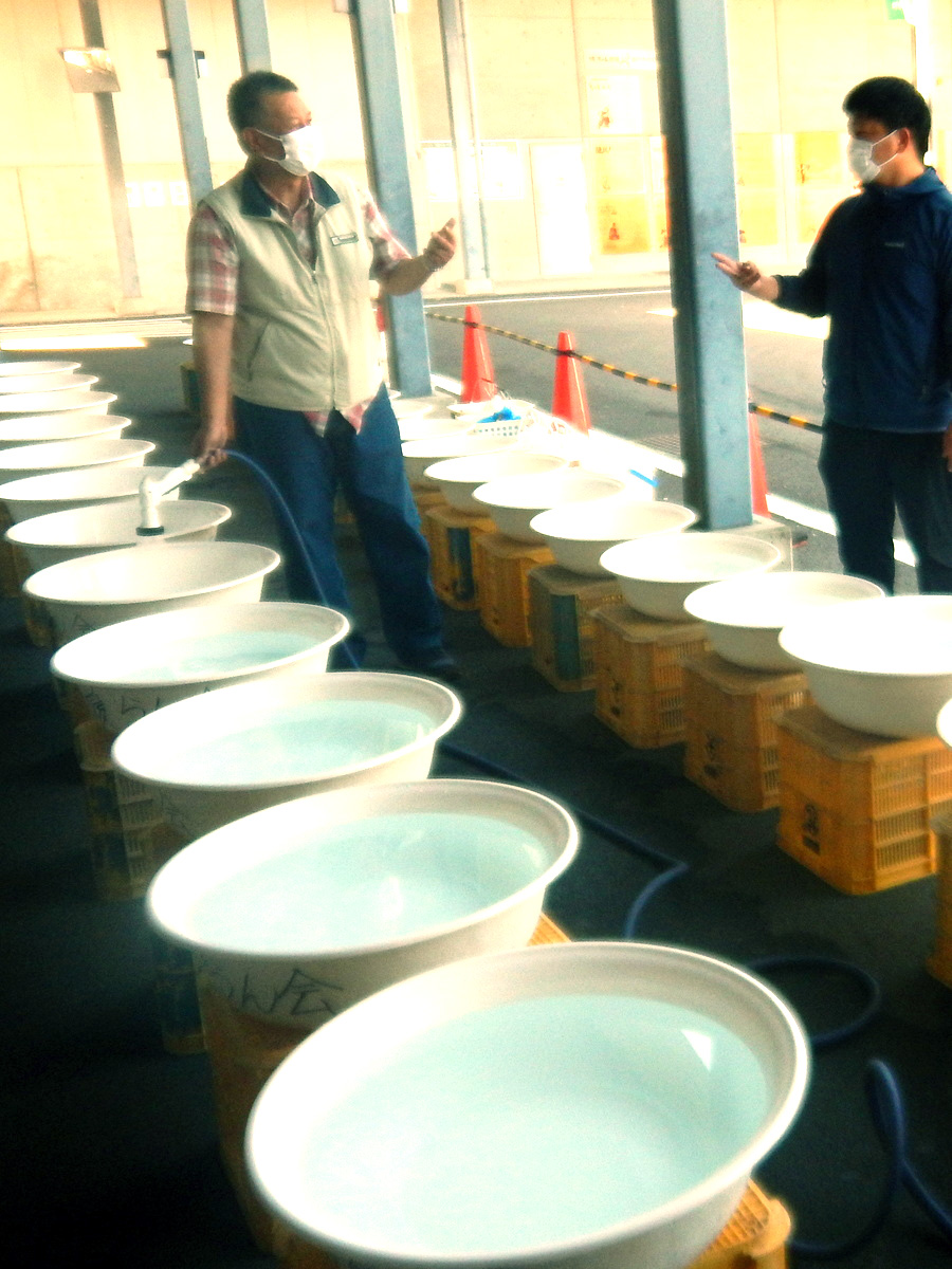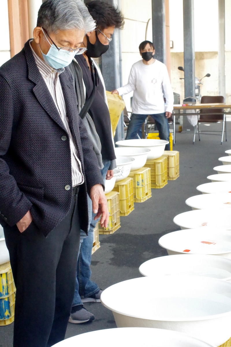 主な目的は魚の取り違い防止。媛らん会の春ような小規模な品評会で必要なのかとも思いますが、コロナ禍が明けたら秋にはゲストもいっぱい来られるでしょうから、予行演習も兼ねて。