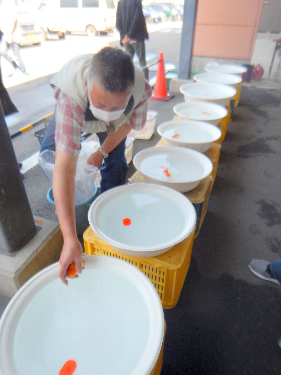 会員は本部で受け付けを済ませ、洗面器に入れる「番号入り小判札」を受け取り、らんちゅうとともに洗面器に入れていきます。