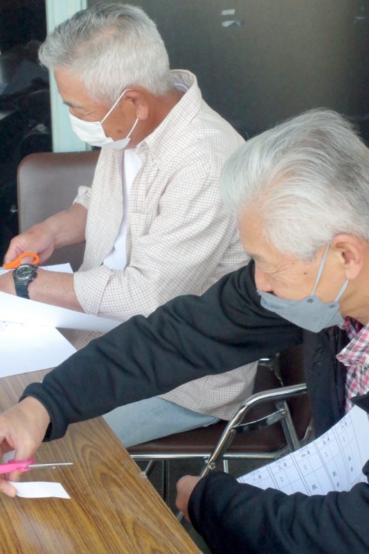 洗面器に貼る順位札など、紙を細かく切る作業はベテランさんが担当してくれました。