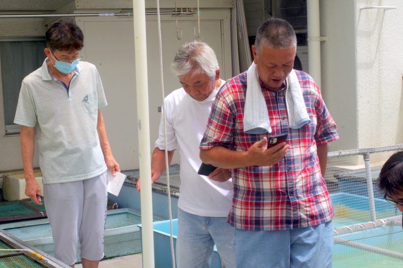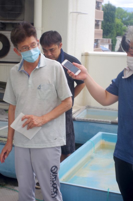 会長さん(写真左)以下、暑い中、魚をじっくり観察。