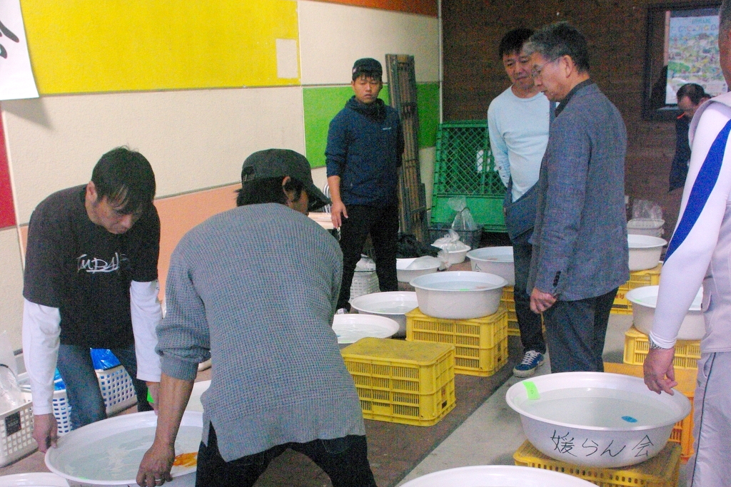 媛らん会の若手だけでなく、ベテランも、時には審査員の方まで洗面器を持って「ヨッコイショ」。