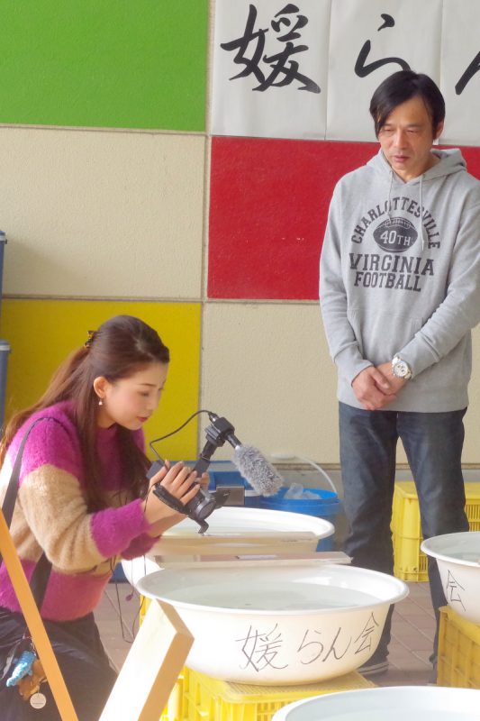 媛らん会の会長さんを、らんちゅう愛好家として取り上げる流れで、会場の模様や会員の話など、熱心にカメラを回しておられました。