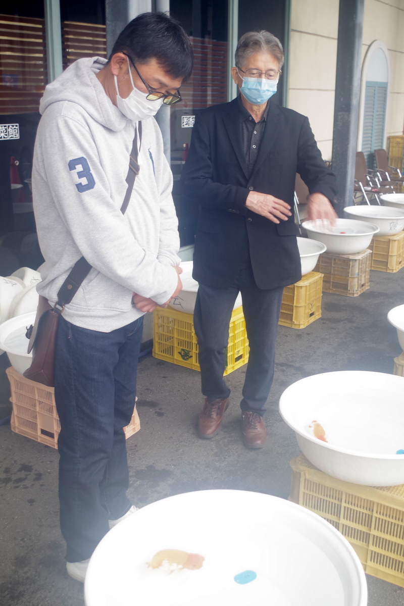 記念すべき第10回の媛らん会秋季品評会で審査員を務めていただいたのは、らんちゅう界で知らない人はいない有名人、工藤千尋さん(写真左)。
